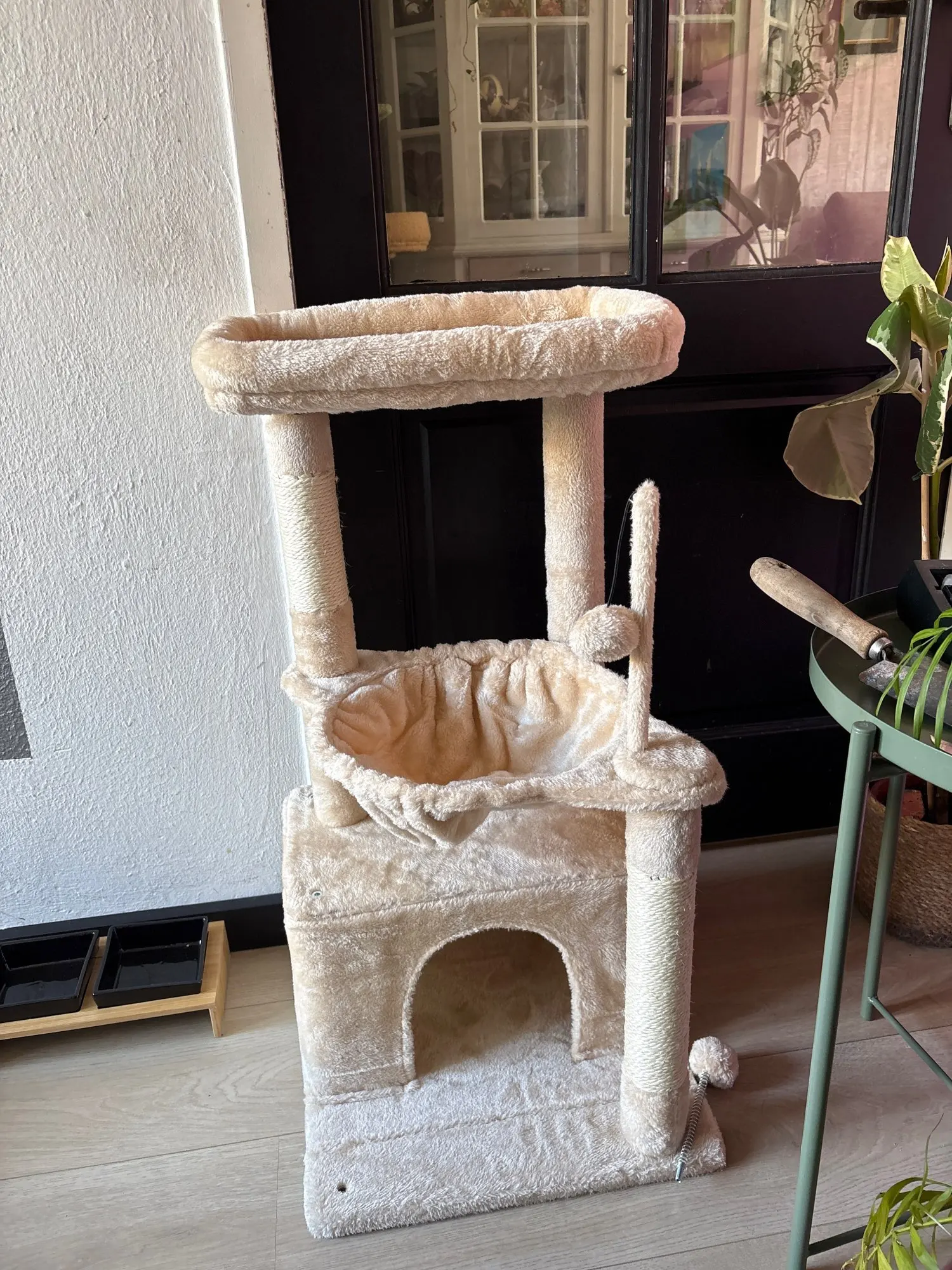 Looks lovely, strudy, is built to be attached to the wall so it doesn’t topple over. Very well packed and delivered from france in a week. You dont need additional tools to assemble, everything is provided. The kitties are yet to test it but looks lovely!