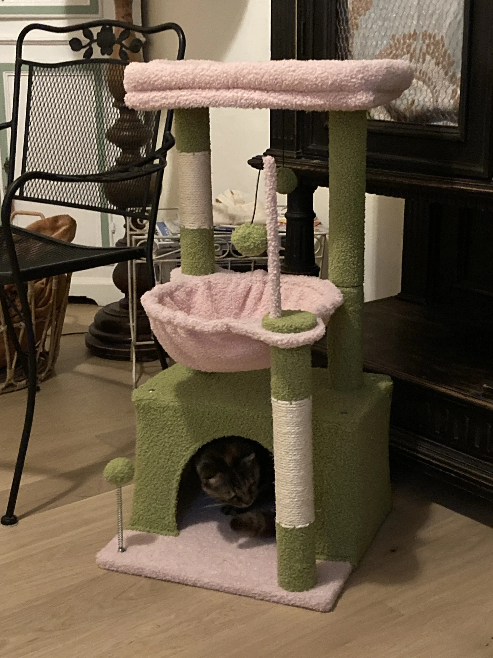 Easy to Assemble and Nice Looking: Its attractive look will match with any room in your house like a piece of nice pet furniture rather than a jungle gym. All the necessary tools are included, just following the instruction step by step. It’s super easy to set it up.